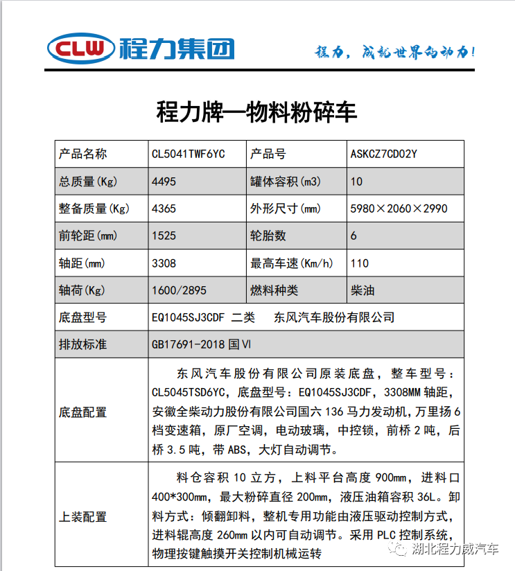 底盘配置 东 风 汽 车 股 份 有 限公司原装底盘,3308MM轴距,安徽全柴动力股份有限公司国六136 马力发动机,万里扬6档变速箱,原厂空调,电动玻璃,中控锁,前桥2吨,后桥 3.5 吨,带 ABS,大灯自动调节。上装配置 料仓容积 10 立方,上料平台高度900mm,进料口400*300mm,**粉碎直径200mm,液压油箱容积36L。卸料方式:倾翻卸料,整机专用功能由液压驱动**方式,进料辊高度 260mm 以内可自动调节。采用PLC **系统,物理按键触摸开关**机械运转